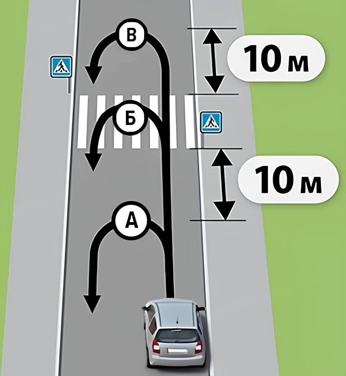 А — дозволено, розворот виконується на відстані 10 м від пішохідного переходу;